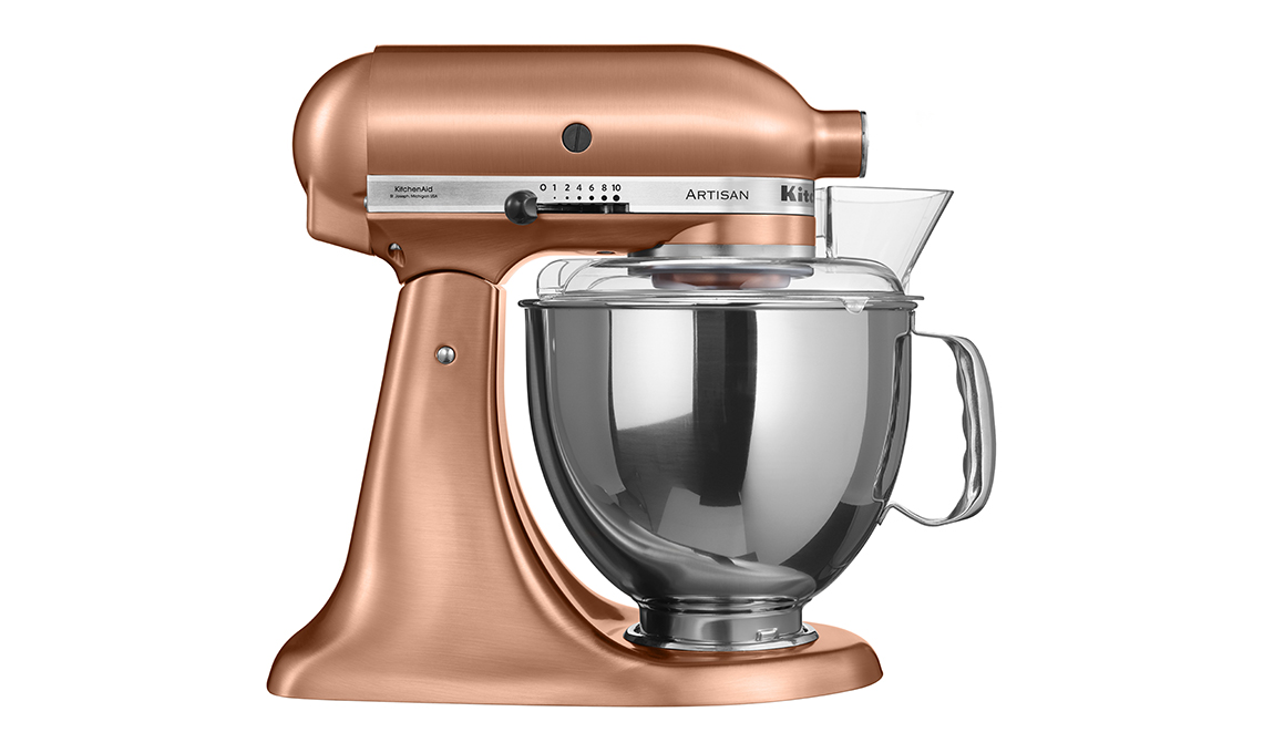 rame satinato del Robot da Cucina Artisan 5KSM175PS, con ciotola da 4,8 litri in acciaio inox per lavorare fino a 1 kg di farina comune e 12 albumi medi [KitchenAid €899].