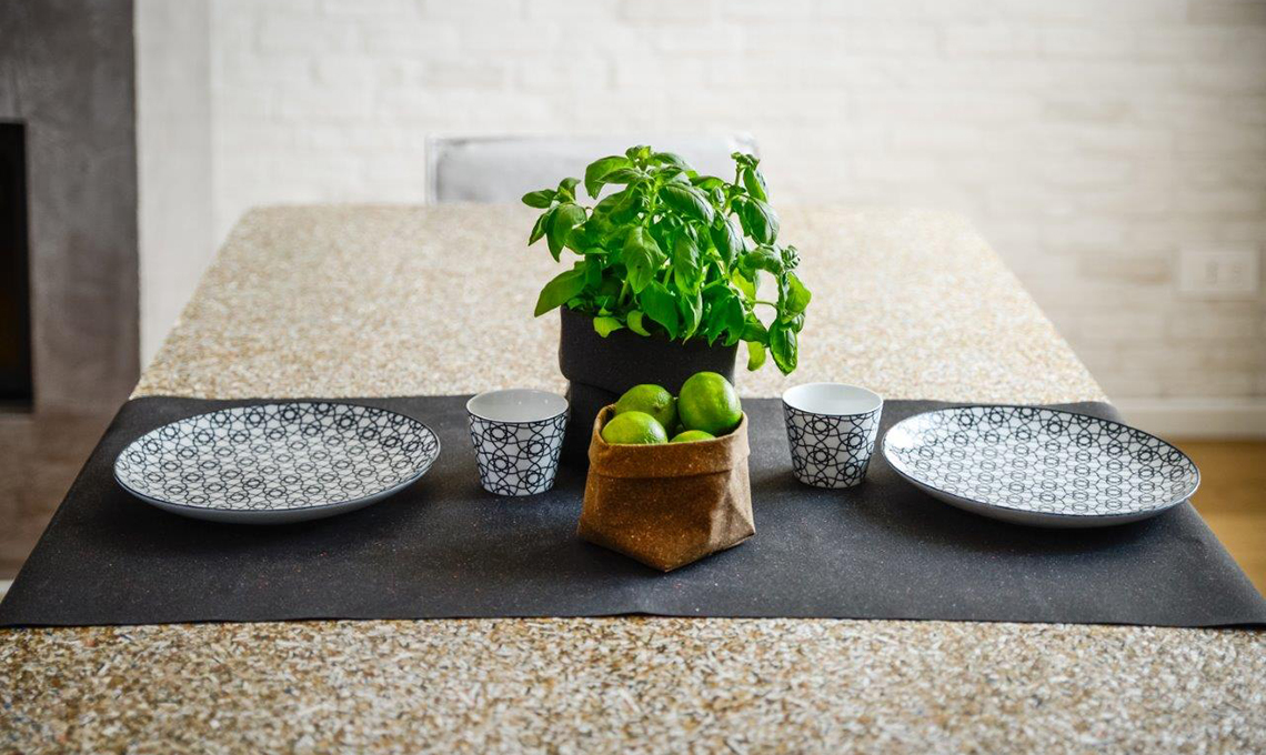 È in cuoio rigenerato, materiale nato dalla lavorazione degli scarti di fibre di pelle il runner per una tavola originale e bella, da abbinare a Sacchetto o Sacchino F, per contenere pane o grissini [Essent'ial, il runner da cm 48x120 €21,50, Sacchetto €35 e Sacchino €21].