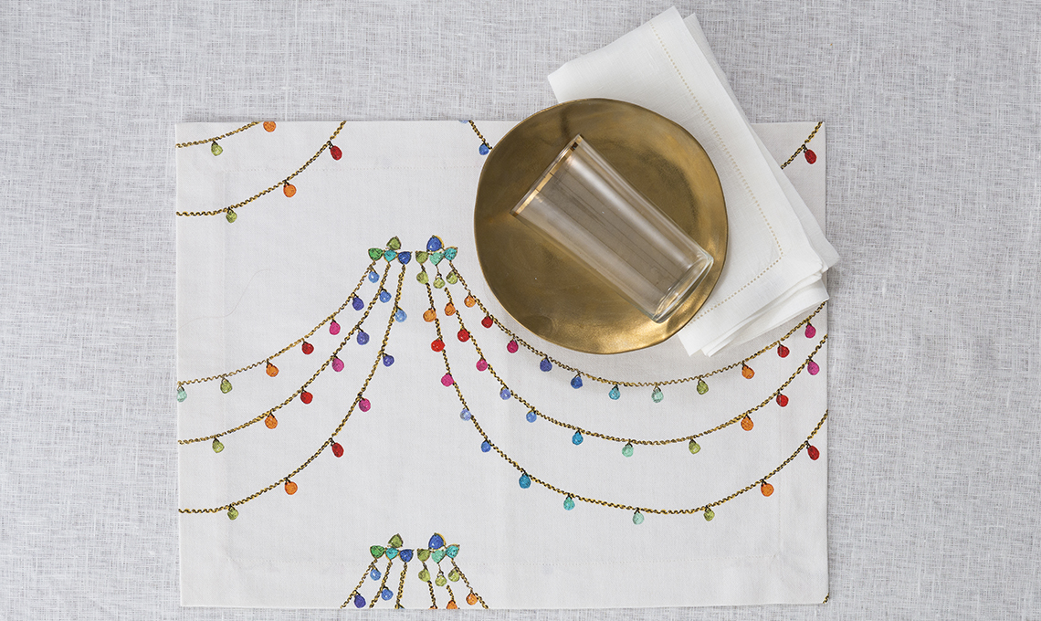 È superchic la tovaglietta della collezione The Jewel con decoro di pietre preziose e catene d’oro per una tavola al femminile; in puro cotone abbinata a tovaglioli bianchi o colorati in lino con orlo à jour [Milou Milano, cm 35x48 da €27 il set americana + tovagliolo].