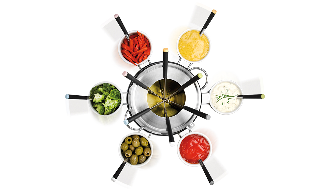 È conviviale il set Siesta per preparare bourguignonne, fonduta e raclette. Con 2 contenitori, uno in inox e uno in ceramica, 6 forchette, 6 ciotole e 6 cucchiai [Tescoma, Ø cm 40x20h €149].