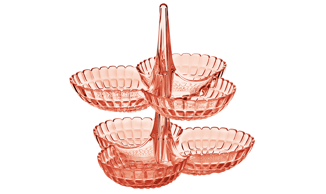 Per servire gli stuzzichini di aperitivo oppure la piccola pasticceria o i cioccolatini è perfetta l'antipastiera Tiffany che può essere venduta sia come pezzo singolo (a tre ciotole) sia in due pezzi da fissare a un supporto verticale per realizzare un'alzatina multipiano [Guzzini, cm 27x25x25,5h €24].