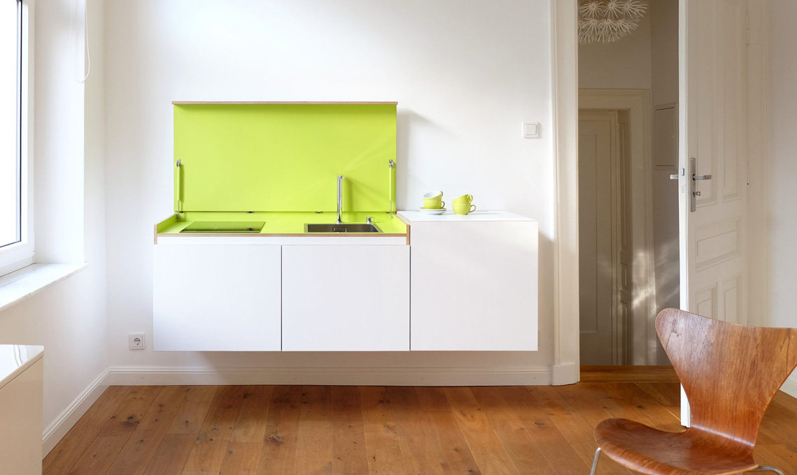 Miniki presenta un sistema sospeso disegnato da Tobias Schwarzer: un sideboard dal design minimal ed essenziale che in realtà nasconde un insospettabile angolo cottura. Non c'è dubbio che una soluzione del genere è ideale per i piccoli ambienti nei quali l'ordine è sempre una cosa gradita. Slimline di Miniki, il modulo con doppia postazione cottura+lavello misura L 120 x P 60 x H 60 cm. È realizzata in HPL (laminato ad alta pressione) è resistente all'acqua e al calore, agli urti e ai graffi per una facile manutenzione e una lunga durata. I prezzi variano a seconda della composizione. Potete provare a configurare la vostra mini cucina nell'apposita sezione del sito di Miniki.
