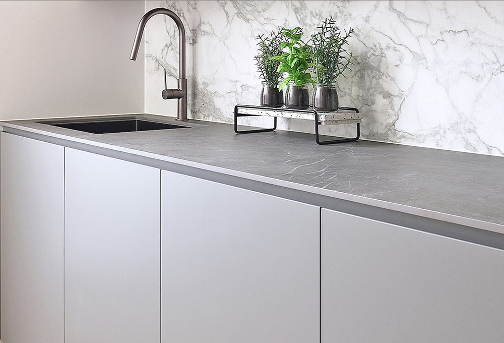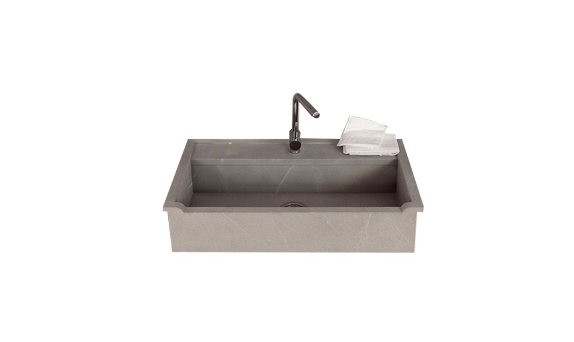 Formato da polveri di quarzo e resine ricomposte per ottenere un materiale super resistente a urti, graffi e macchie, dalla ridotta porosità, permette di integrare il lavello nel top per creare una superficie unica come Integrity Q di Cosentino.