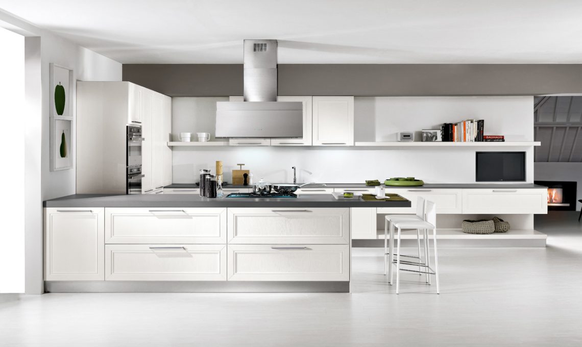 La cucina Itaca sfrutta i segreti di quelle professionali. I vani sotto i fuochi sono attrezzati con vassoi estraibili dotati di vaschette in acciaio inox chiuse da coperchi: servono per conservare cibi a lunga scadenza (riso, pasta, granaglie, ecc.). Per sfruttare lo spazio e renderlo più funzionale, la penisola ha basi a doppia profondità accessibili dai 2 fronti. La cucina nella foto è caratterizzata da ante a telaio in frassino massello laccato a poro aperto bianco. Basi, pensili e colonne sono in total white come la maxi cappa in vetro (si apre quando azionata). Maniglie e zoccolo in acciaio satinato, top in laminato martellato grigio.