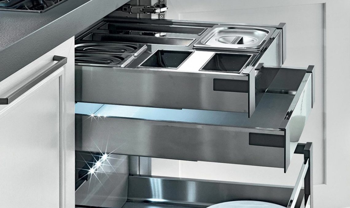 Gli accessori interni in acciaio inossidabile con i quali è possibile organizzare i cassetti sono di tipo professionale e chiudibili con coperchi [Arredo3].