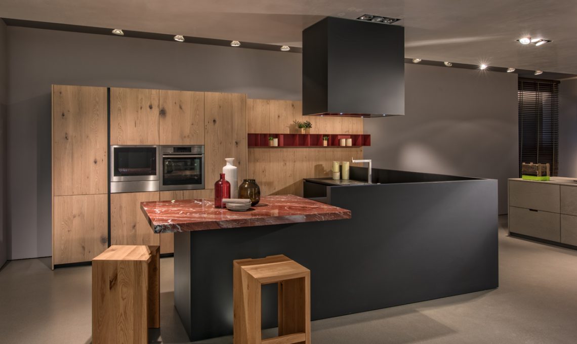 Nella cucina Aspen l’organizzazione interna dei cassetti è minuziosa, affidata a elementi in legno con divisori verticali posizionabili a piacere per i piatti, ed elementi modulari per posate e utensili, subito sotto il piano di lavoro. In più, appena si aprono i cassetti una luce a led illumina il contenuto. La cucina ha telaio in alluminio 100% riciclabile su cui si montano i profili nei materiali più svariati. Qui viene proposta con Fenix® nero per le basi e rovere nodato baltico per le colonne su scocca grigio sabbia. Il top della zona operativa è sempre in Fenix® nero mentre quello del banco snack è in marmo rosso Francia lucido.