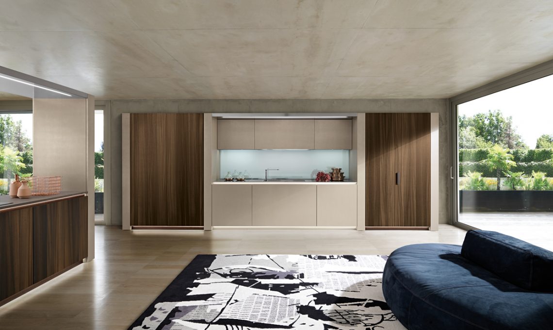 La cucina Arte, progettata da Marco Piva, ha ‘colonnine’ larghe 15 cm (Side Unit) che la definiscono visivamente, ma in più si estraggono e all’interno sono attrezzate a griglie per contenere bottiglie, barattoli, ecc. Il top è profondo cm 80 anziché 60 e, verso la parete, ingloba il canale Gap, uno spazio con vani contenitori e accessori tra cui l’unità di ricarica wireless a induzione. Qui ha frontali Satin nichel laccato effetto acciaio e in termotrattato Eucalipto.