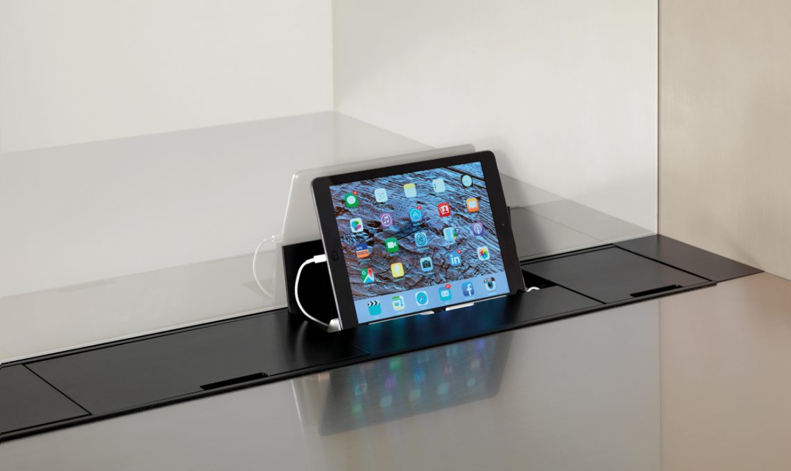 La parte terminale del piano di lavoro, verso la parete è organizzata con il canale Gap (profondo 20 cm) che ospita il comodissimo carica batterie di tablet e smartphone [Euromobil].