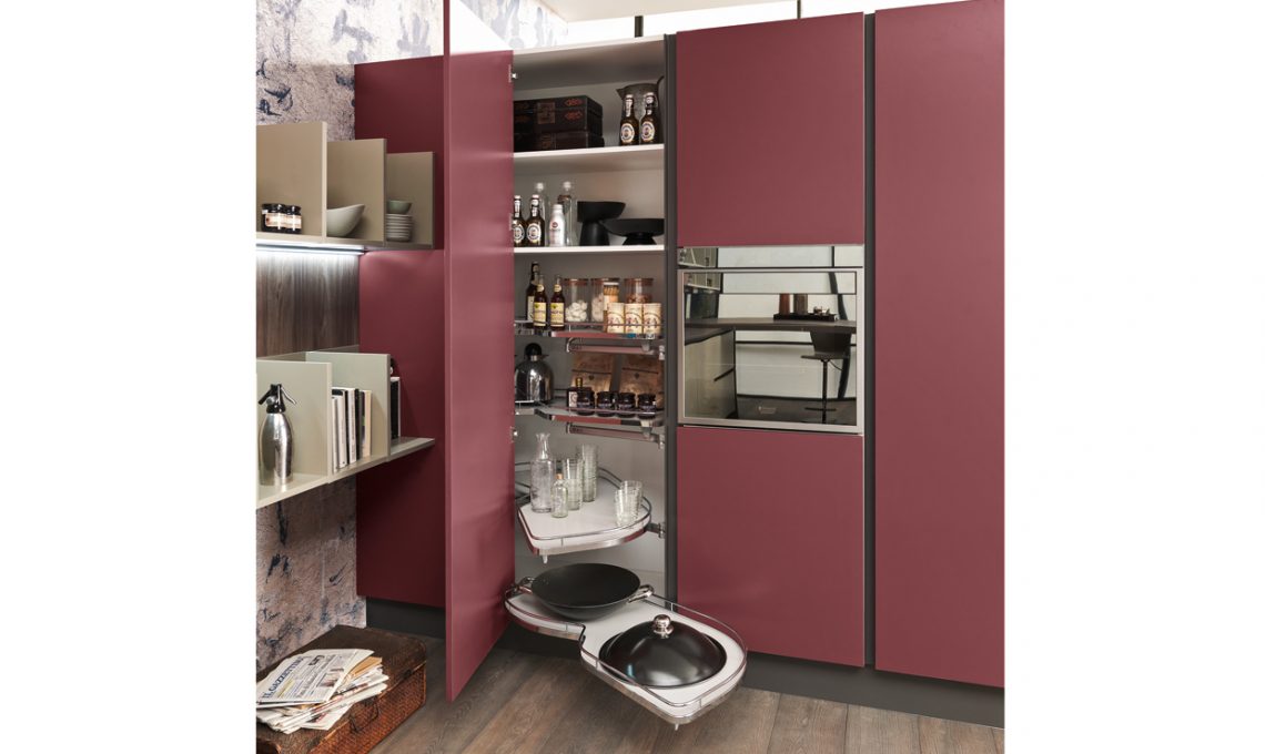 La colonna angolare, solitamente difficile da sfruttare, qui è utilizzata al massimo anche in altezza. I piani girevoli sono veloci da estrarre [Febalcasa].