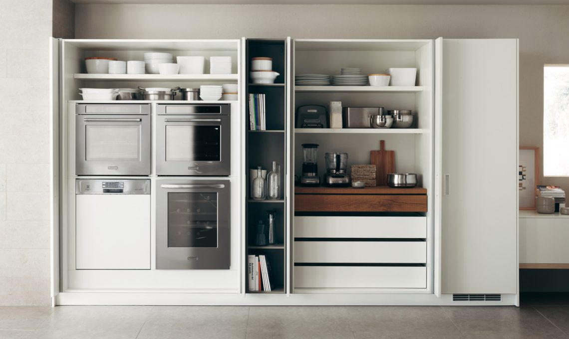 L'armadio Switch ha le ante che rientrano ed è organizzato per accogliere elettrodomestici a incasso più cassetti e ripiani per stoviglie e tovaglie [Scavolini].