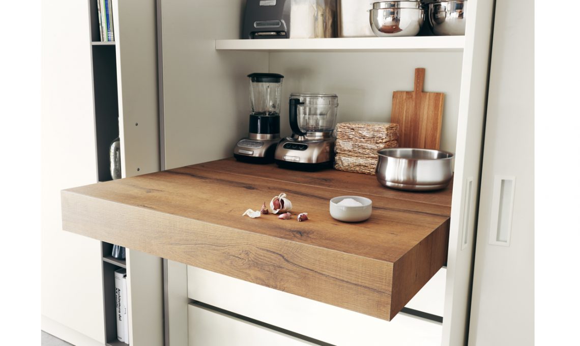 Nell'armadio Switch, sotto il ripiano in legno per i piccoli elettrodomestici, c’è un elemento che si estrae e si alza a filo per creare un unico piano di lavoro:superfunzionale! [Scavolini].
