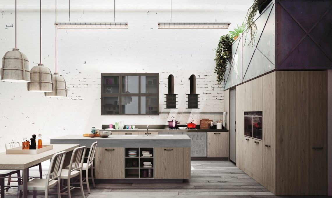 La cucina Loft in questa versione è perfetta per chi sogna una dispensa o una zona di servizio, come quelle di una volta, accessibile proprio dal locale cucina. Il modulo angolare Container è una vera stanza nella stanza, funzionale e integrata con il resto dei mobili della cucina. Esiste in due dimensioni da 150 e 220 cm con 3 diverse possibilità di organizzazione interna: lavanderia, dispensa e mista. In Loft si combinano materiali diversi, in perfetto stile urban: il legno materico delle ante mixato con la finitura peltro, l’effetto metallo dei contenitori a giorno con struttura in alluminio verniciato finitura peltro come le cappe e i pensili con vetro retinato in finitura bronzo.