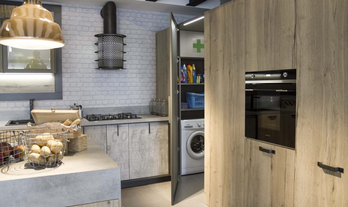 Il sistema angolare Container, perfettamente integrato con i mobili della cucina, può ospitare la lavanderia, la dispensa o un mix tra i due [Snaidero].