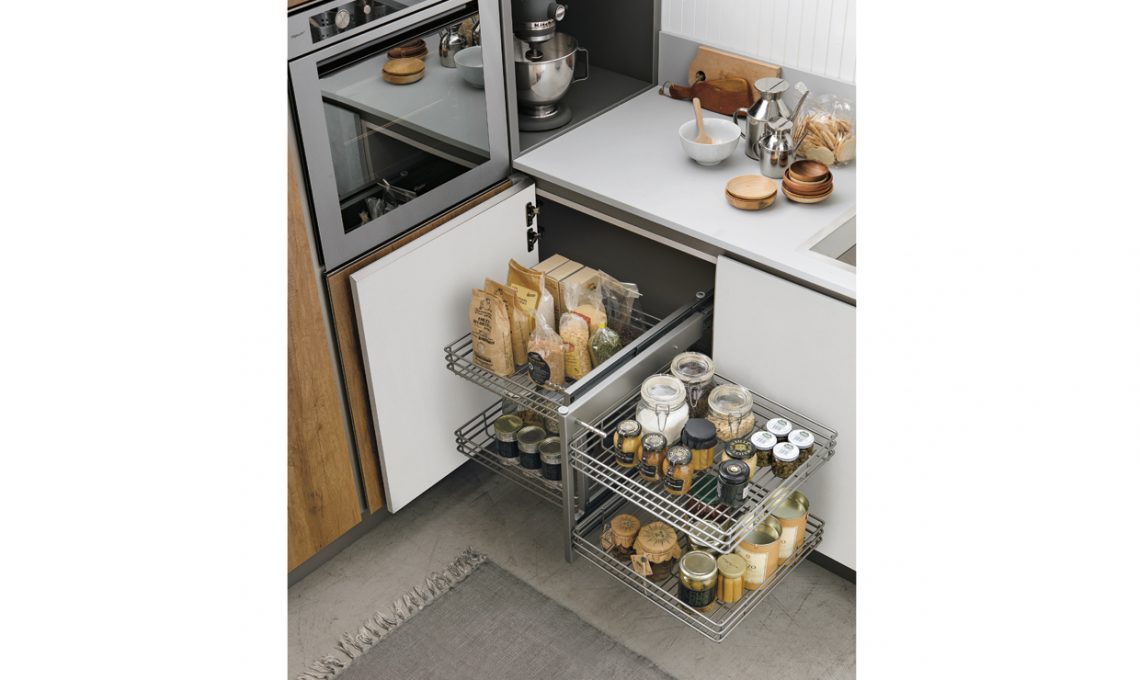 Il sistema estraibile a doppio carrello con ripiani quadrati permette di sfruttare completamente l’angolo e di raggiungerne il contenuto facilmente [Stosa].