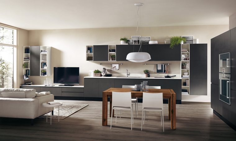 La cucina Marina Line è pensata a vista sul living, ma ha un’intera parete a colonne che funge da divisorio tra un ambiente e l’altro. La struttura quadrata rende comodissimo muoversi e lavorare. Due soluzioni pratiche: i piani girevoli ed estraibili con cui è attrezzata la colonna d’angolo; i vani a giorno sopra il piano di lavoro per condimenti e piccoli elettrodomestici. Qui ha basi in laminato grigio efex opaco, pensili e colonne in laminato porpora opaco, pannello e terminale a giorno in nobilitato.