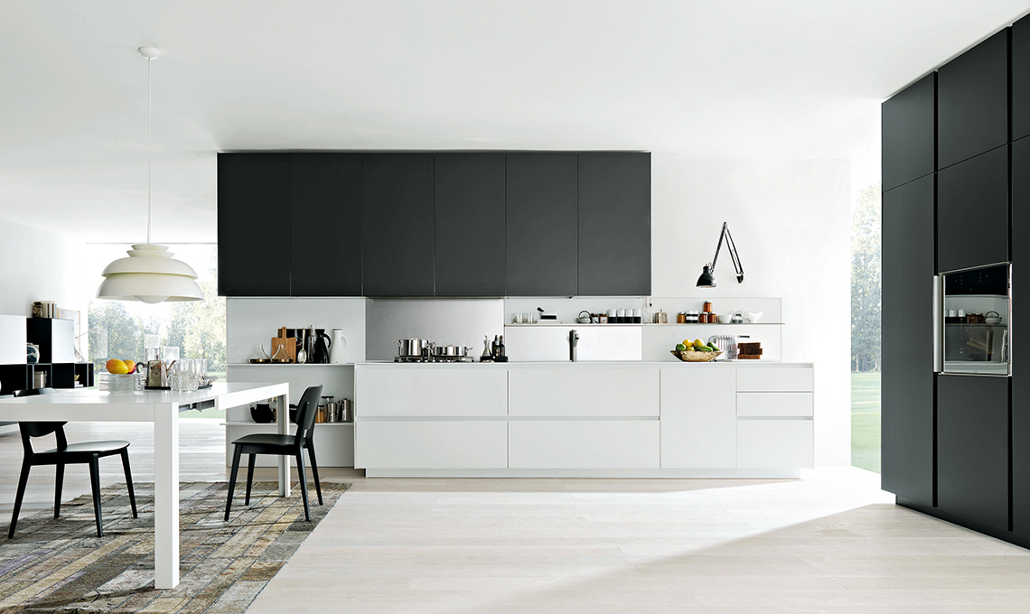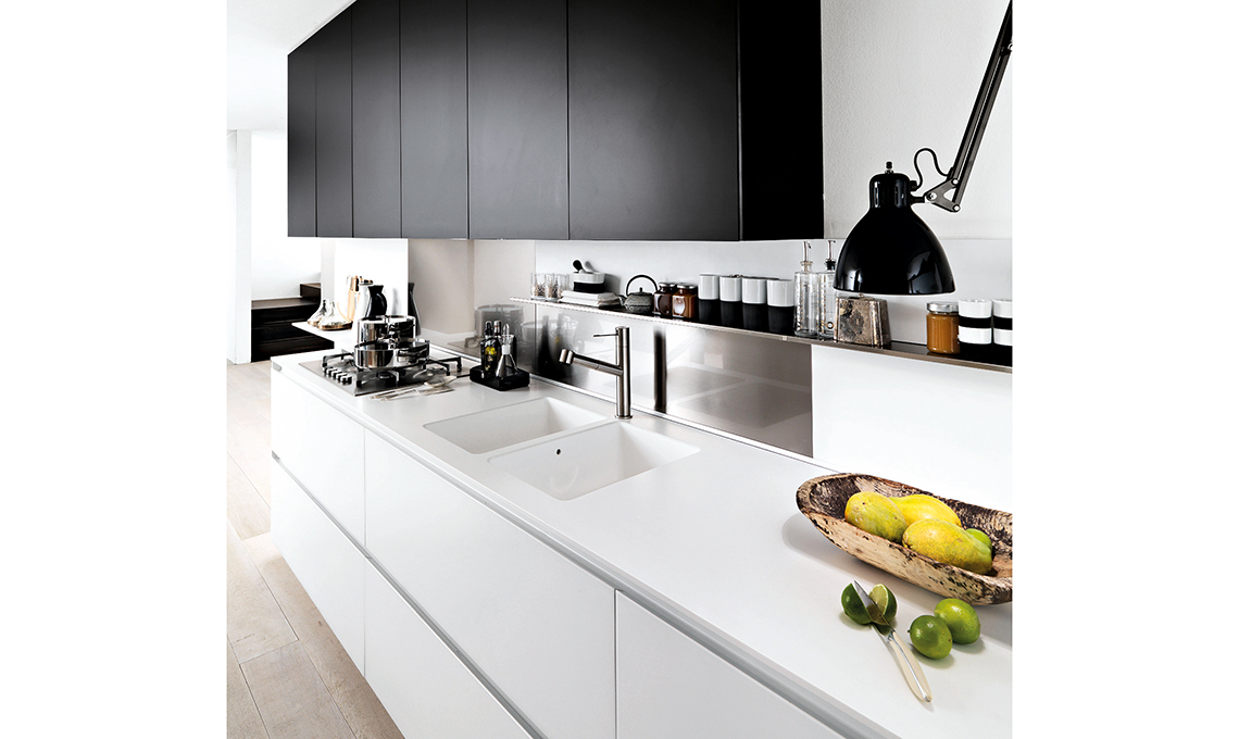 La parete tra base e pensile è attrezzata con boiserie a cremagliera orizzontale Horizon, che offre la massima personalizzazione poiché si completa con mensole a L, cubi portaoggetti, portaspezie, porta-bicchieri e altro. I pensili in vetro nero assoluto contrastano bene con le basi bianco ottico, entrambi opachi. Per sottolineare l’effetto minimal, la cappa è incassata, quindi a scomparsa.
