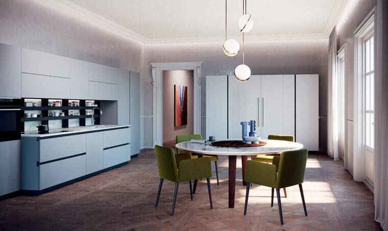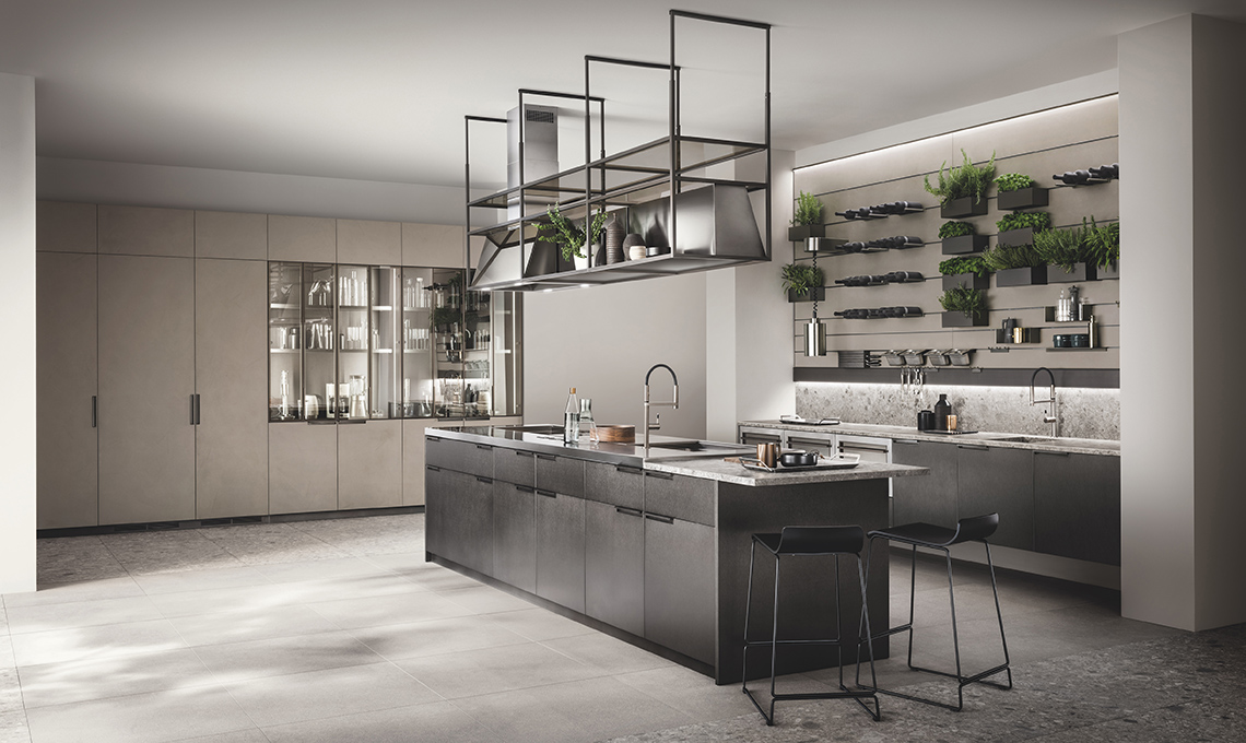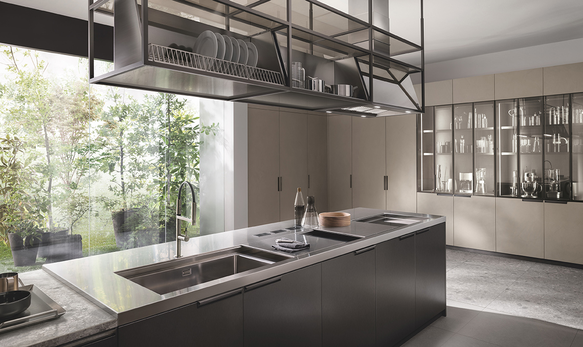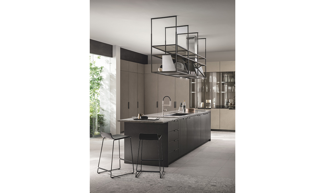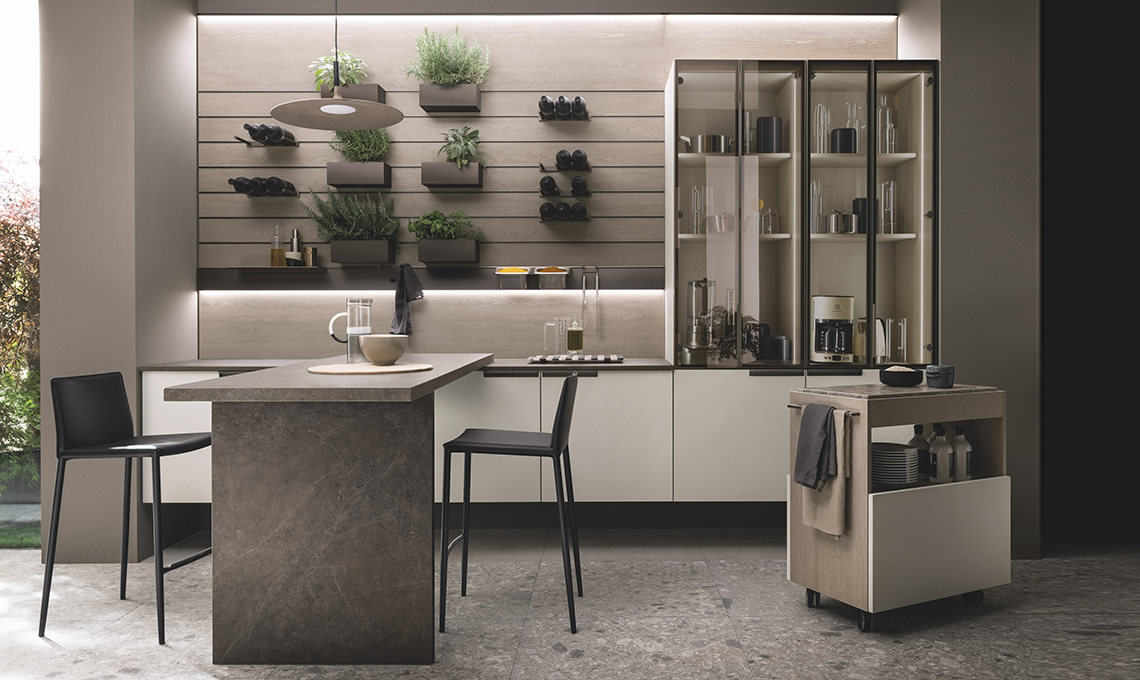Come si organizza la cucina? In Mia abbiamo pensato di fare delle armadiature chiuse da vetrine per vedere all’interno e aprire solo l’anta in cui si trova ciò che si cerca. I vetri possono essere leggermente oscurati, effetto vedo-non vedo, per mimetizzare l’eventuale disordine (che non dovrebbe esserci ma inevitabilmente c’è...). In particolare, sono utili i moduli per i piccoli elettrodomestici: possono essere dotati di prese di corrente per usare frullatore, mixer, tritatutto senza neanche tirarli fuori. Poi ci sono i portaspezie che si possono inserire sul piano di lavoro o sulla boiserie, sempre a portata di mano. E c’è la cappa che si ispira a quelle professionali nell’estetica e nella funzionalità, con griglie inclinate che facilitano l’aspirazione dei fumi.