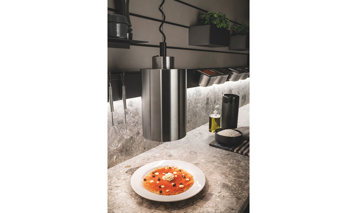 Quanto c’è della sua cucina professionale in Mia di Scavolini? Molte cose. Prima di tutto il piano in acciaio che scorre sopra al lavello e al piano cottura. È un accessorio professionale, ma utilissimo anche a casa: permette di usare lo stesso spazio per più funzioni. Tiro il piano sopra i fuochi e taglio; lo sposto e poso la pentola a cuocere. Anche pulire diventa più facile. Un altro accessorio interessante è la lampada che tiene in caldo mentre si impiatta: nessuno ce l’ha a casa perché pensa sia superflua, invece è utile per non far raffreddare i piatti prima di portarli in tavola.