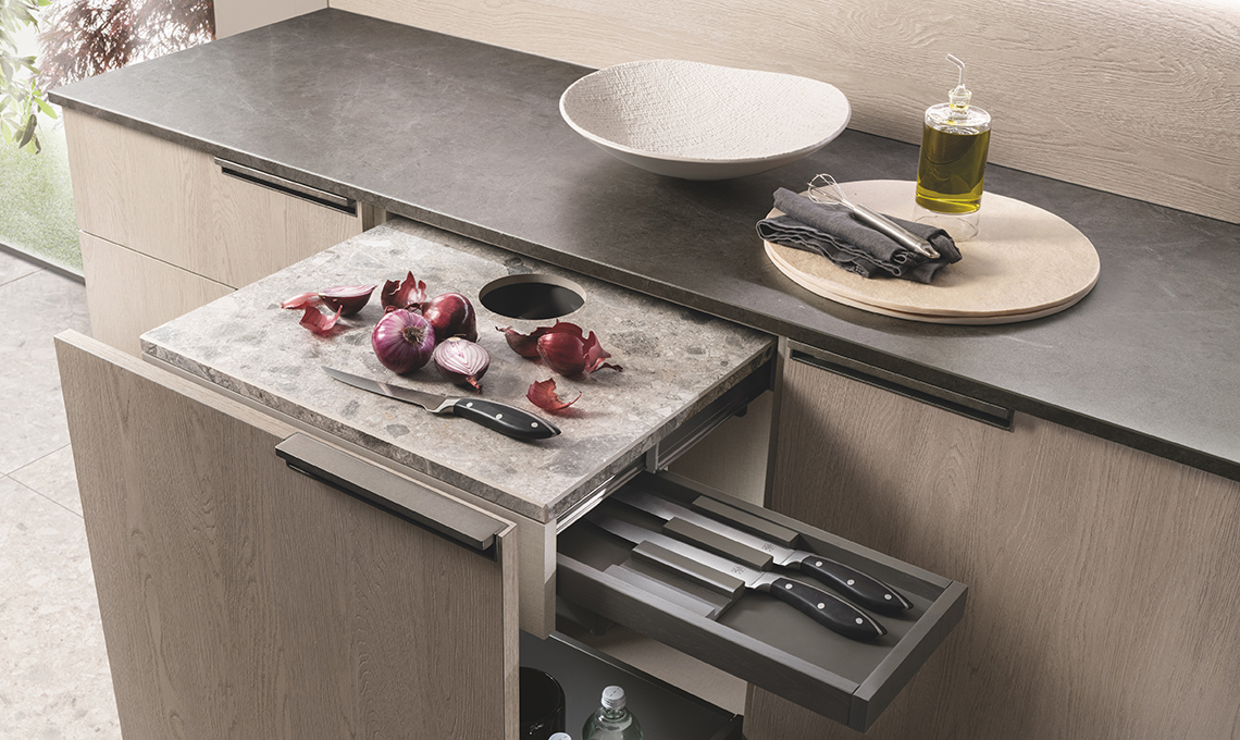 Noi ci siamo innamorati del carrello estraibile multifunzione! come è nato? Dall’esperienza sul campo. Volevo proporre un elemento pratico da trasportare dove serve: il tagliere posto sopra ha un foro attraverso il quale far cadere gli scarti nella pattumiera sottostante; sotto il tagliere c’è il portacoltelli estraibile; e ci sono piani per contenere stoviglie o bicchieri... Il tutto in pochissimo spazio.