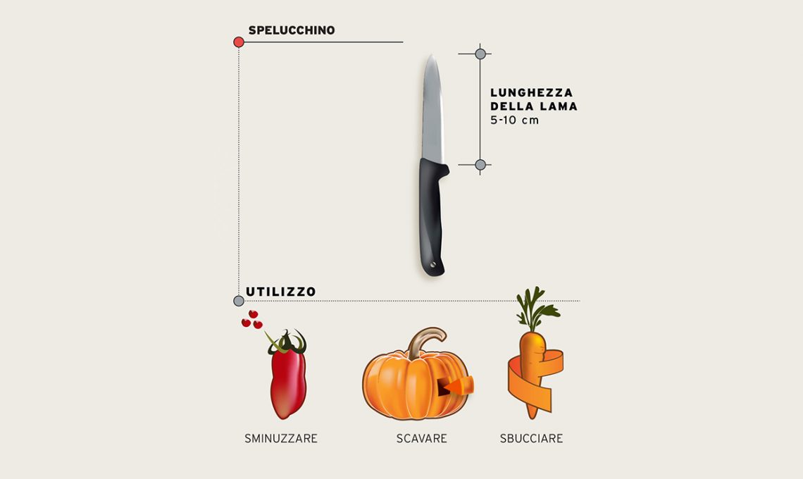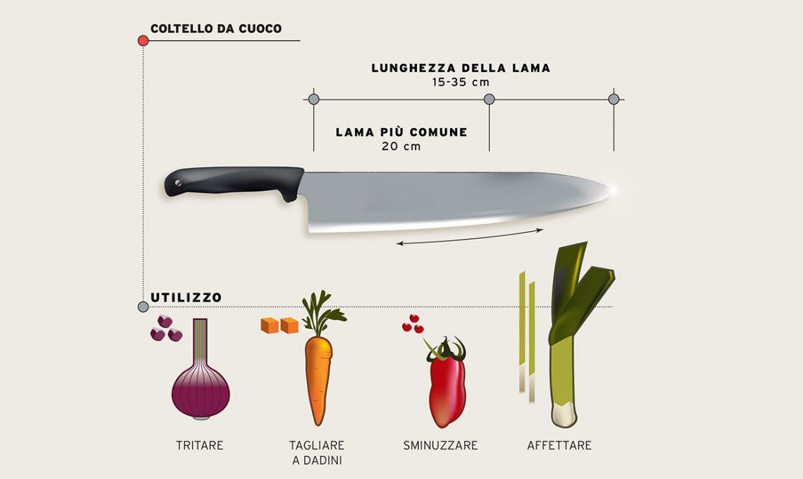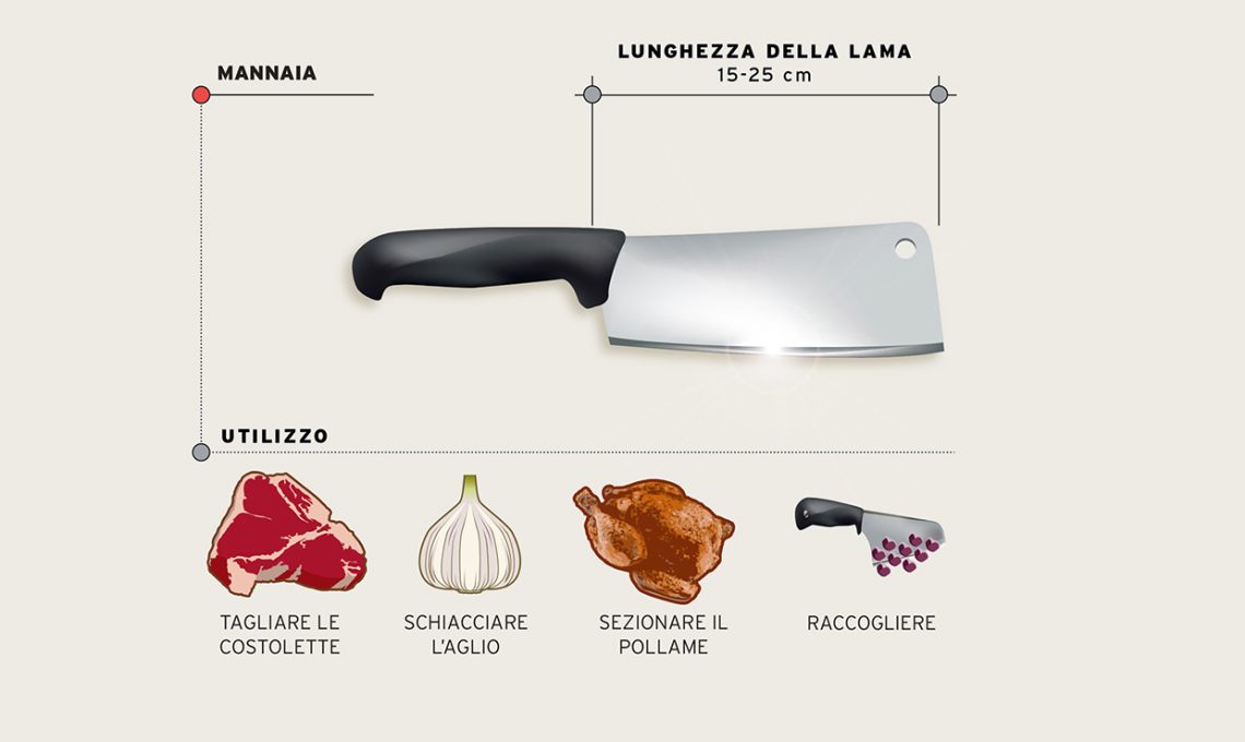 Ce ne sono poi tantissime per svariati scopi: piccole lame per lavorazioni precise e complicate, seghettate per croste e pelli dure, a 'scalpello' perfette per tritare, e la mannaia, larga e rettangolare, per un taglio pesante.