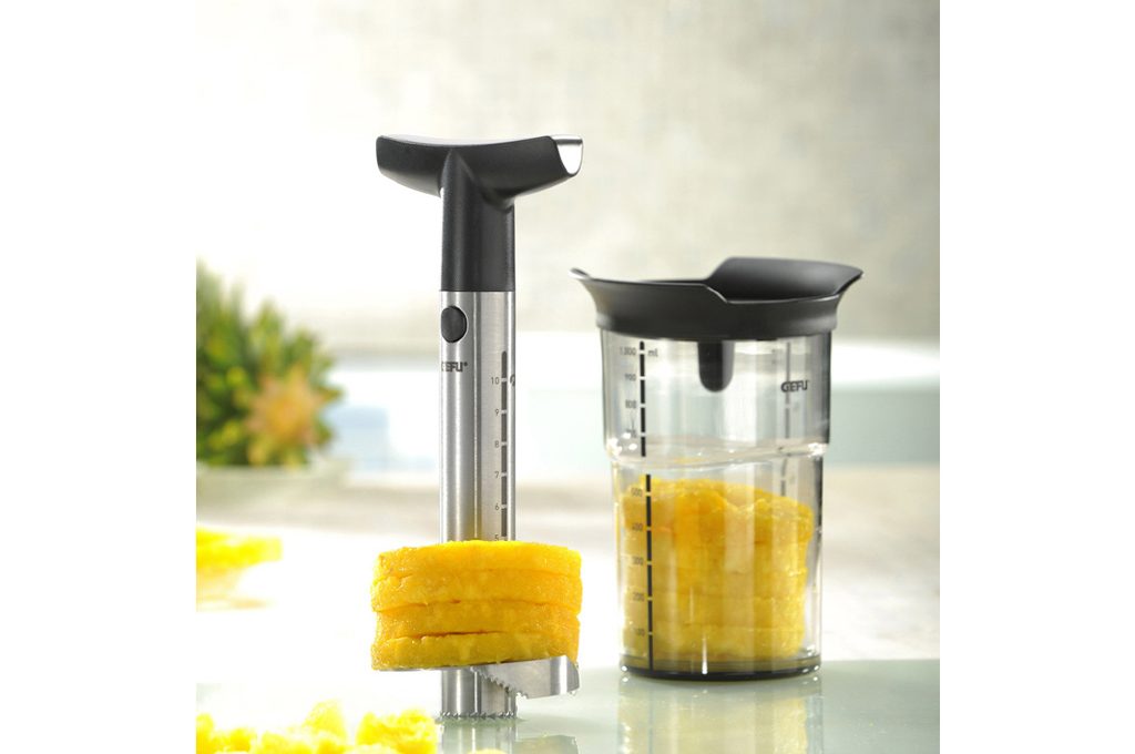 Togli l’anima dell’ananas, affettalo, taglialo a spicchi e conservalo nel contenitore [€ 42 Gefu]