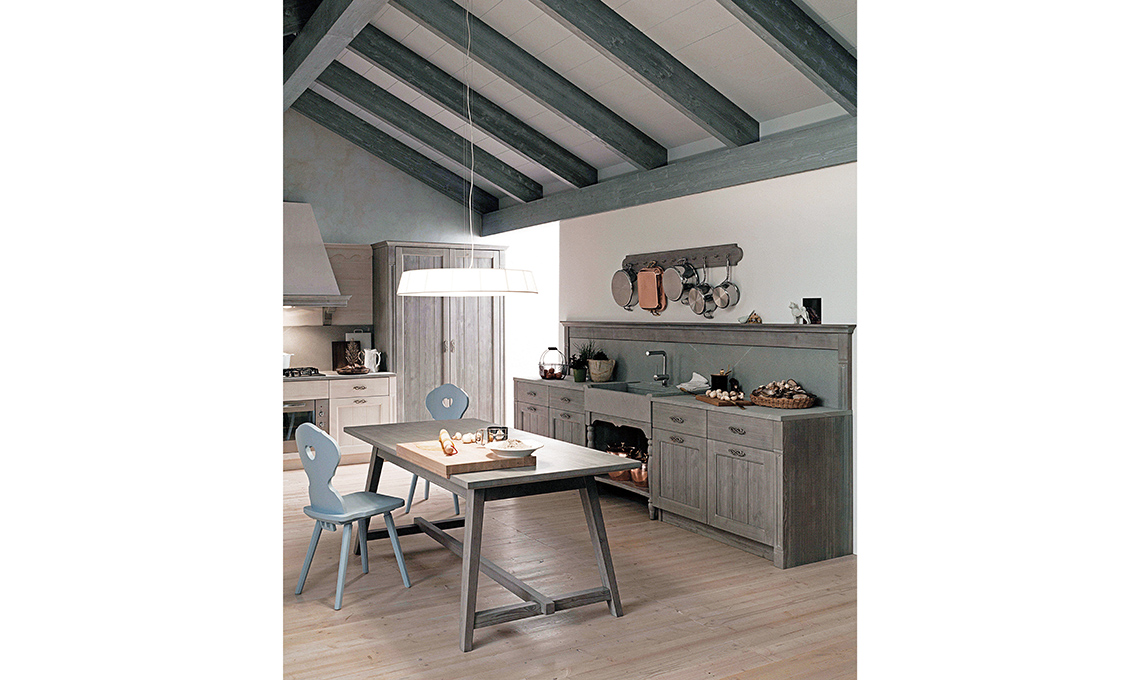 Cucina Maestrale con struttura in legno massello certificato; gli scarti derivati dai tagli del legno vengono macinati e riciclati per le lettiere degli animali e per riscaldare l’azienda! [Scandola].