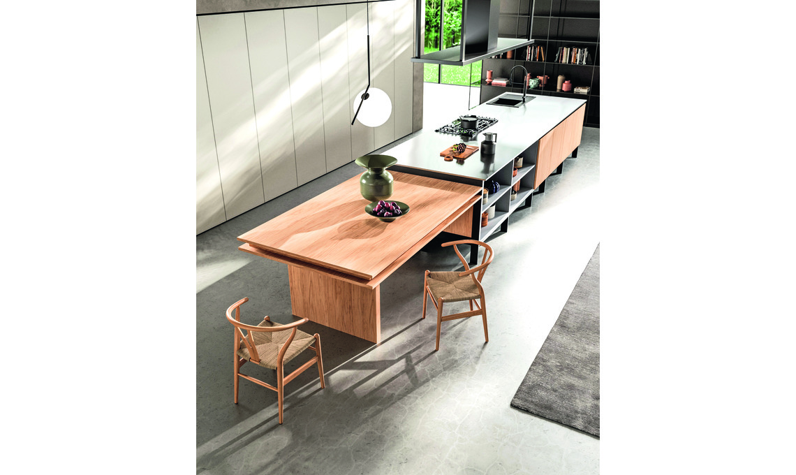 CUCINAnD’O di Aran Cucine, design Davide Oldani, ha un'isola attrezzata con top in acciaio inox, mensole in alluminio nero, vani a giorno in laccato grigio opaco e ante in olmo, snack in legno di olmo, sistema di ante a scomparsa laccato grigio opaco. Il piano del tavolo si ispira a quelli che lo chef Oldani ha nel suo ristorante, con mensola per riporre oggetti e cellulari.