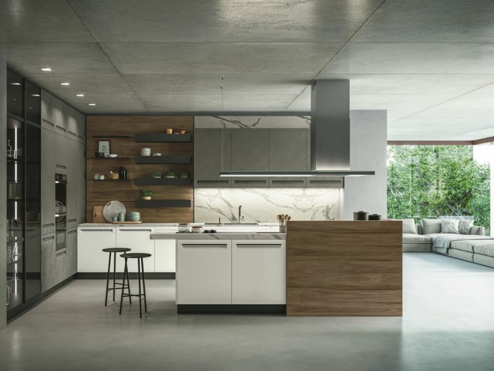 La cucina Luna ha ante in laccato lino e noce canaletto come il piano snack avvolgente, top in laminato marmo nuvolato e libreria in melamminico opaco lavagna [Lube].