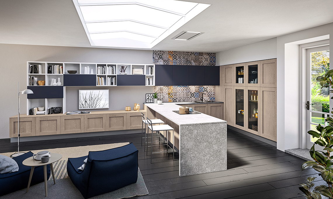 Le ante delle colonne e delle basi di cucina e living sono in rovere dust decapé con telaio in massello di rovere e bugna impiallacciata spessore 25 mm. Per 'spezzare' la continuità del legno, si possono usare due moduli a vetrina dove tenere in perfetto ordine bicchieri e stoviglie. Il vetro Nuntia è a griglia, quindi rinforzato e antiurto.