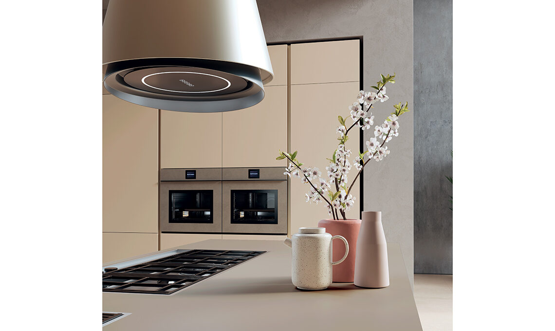 La doppia profondità dell’isola viene sfruttata da un lato con moduli a vetro per le stoviglie e dall’altro con cassettoni per pentole e accessori per cucinare. La zona cottura realizzata a filo top con fuochi dal mood industriale in linea, è sottolineata dalla cappa a isola di design abbinata nei toni al piano di lavoro in Fenix, materiale super resistente, opaco e anti-impronta.