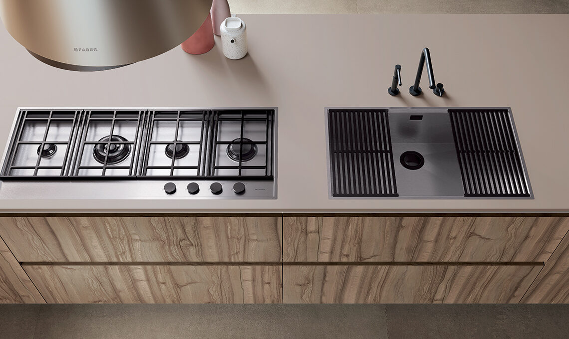 La zona cottura realizzata a filo top con fuochi dal mood industriale in linea, è sottolineata dalla cappa a isola di design abbinata nei toni al piano di lavoro.