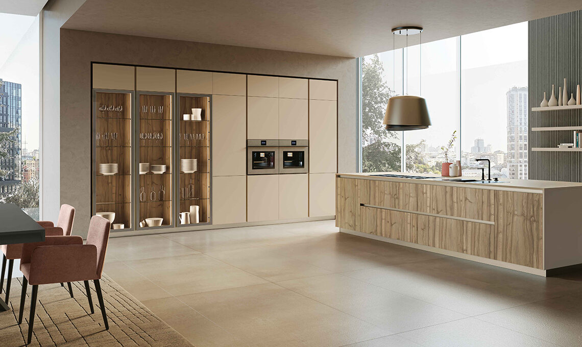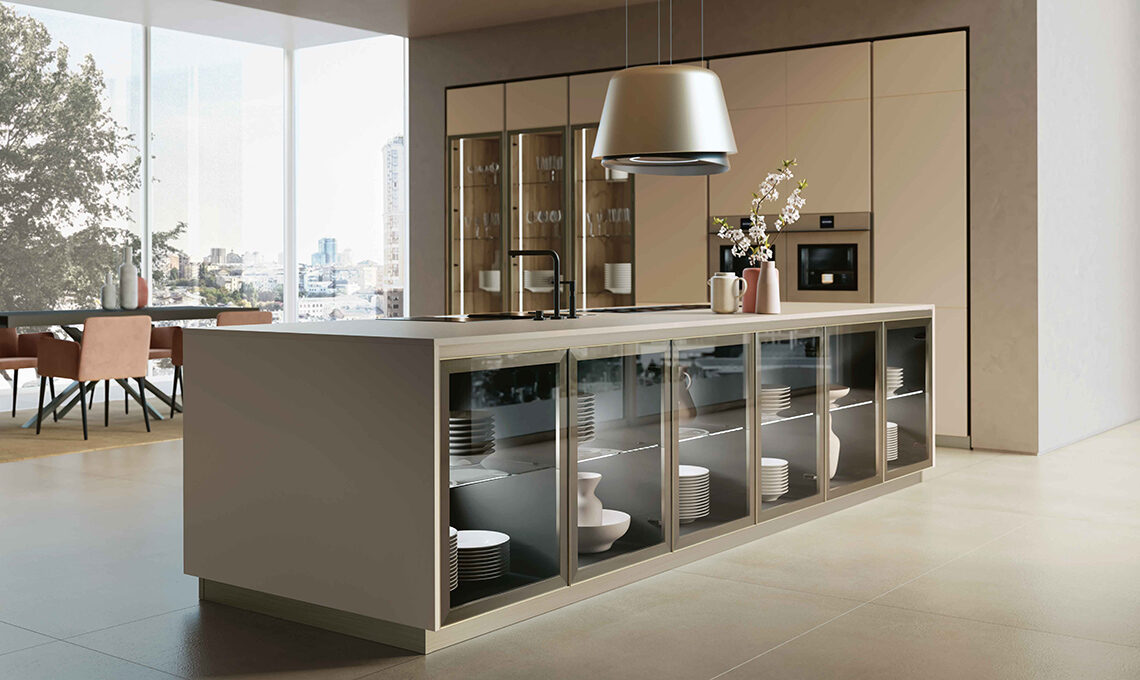 Modula Line Over di Febal Casa con ante delle colonne in laccato opaco cachemire e a vetro trasparente fumé su telaio finitura champagne ripresa su gole e zoccolini, frontali dell’isola in nobilitato Fossil Wood più top in Fenix beige arizona.