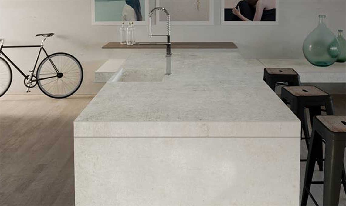 È una pietra ‘sinterizzata’ (compattata in forni a 1.200 °C) realizzabile in grandi lastre sottili da 12 a 30 mm, che non teme acidi, macchie, solventi, muffe e batteri e che resiste a graffi, tagli e calore. In versione Bio-Care è anche antibatterica.