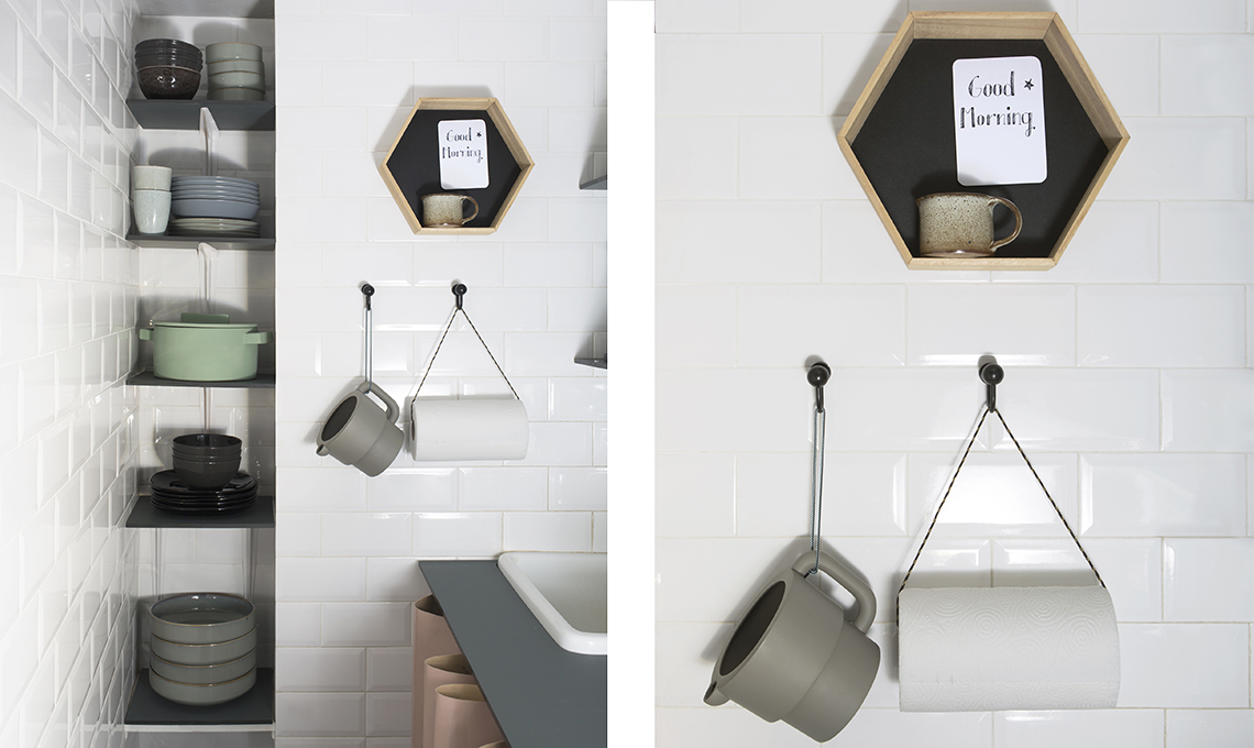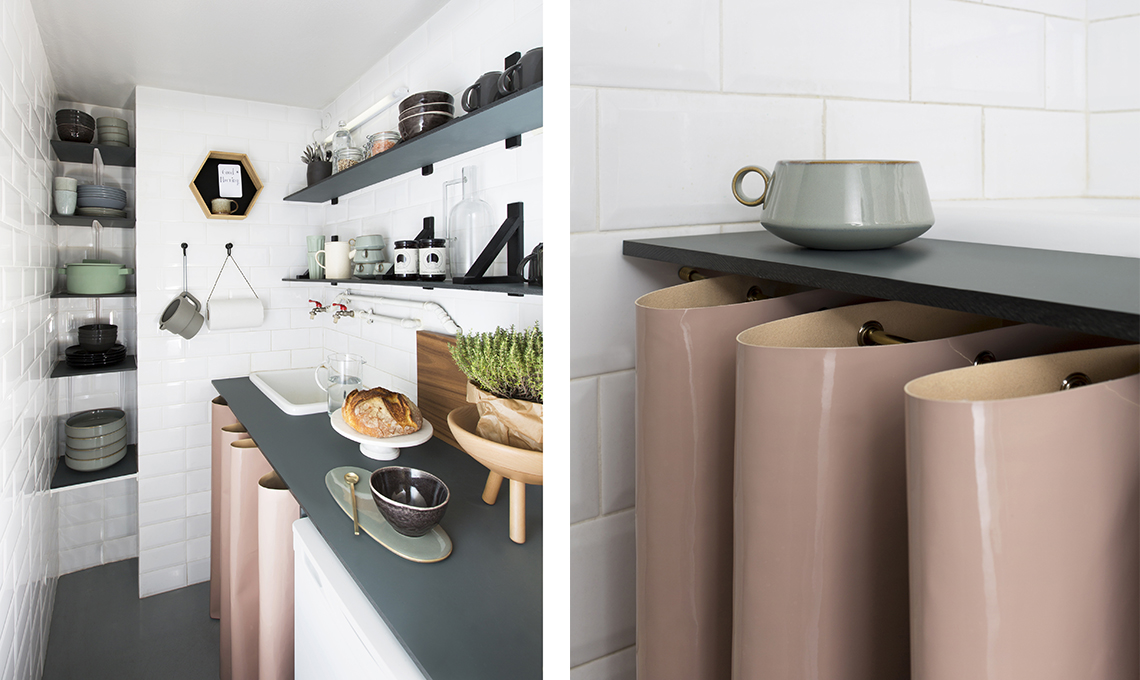 Un ambiente stretto e angusto che ospita la zona ‘operativa’ della cucina, quella in cui si preparano i cibi (i fuochi sono in un’altra porzione del locale, verso la finestra). Un ‘cucinotto senza fuochi’ – come lo definisce la padrona di casa – che aveva bisogno di essere rinnovato. Le pareti sono state rivestite di piastrelle color bianco lucido, per dare maggiore luminosità. Poi, a contrasto si è scelto il Fenix®, materiale morbido al tatto e facile da pulire, per piano lavoro e mensole. Altri dettagli décor – da copiare! – sono i rubinetti in stile industriale e la tenda in pvc rosa per chiudere il vano sottolavabo.