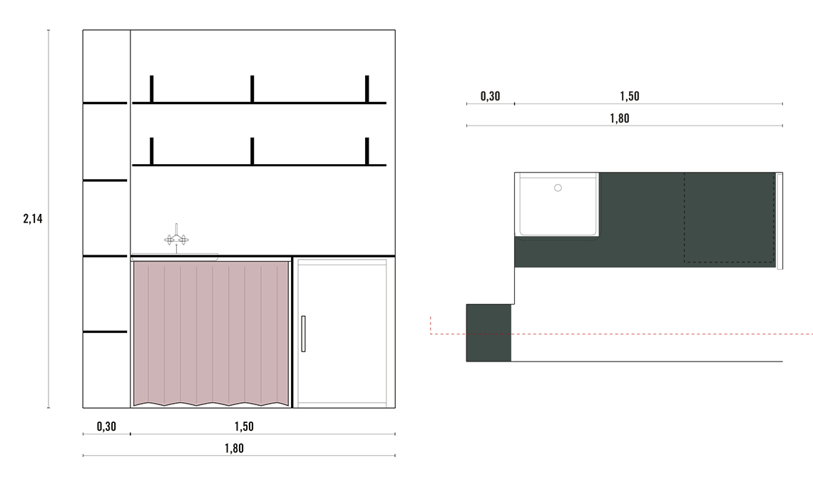 • la tenda fai-da-te: per nascondere alla vista il vano sottopiano, basta un rettangolo di pvc con finitura in vernice rosa lucida e impermeabile. Tagliato a misura (tenendo conto delle abbondanze per le pieghe), è stato forato sul lato superiore per applicare gli occhielli che lo fanno scorrere sull’asta (a pressione, non richiede fori per il fissaggio).