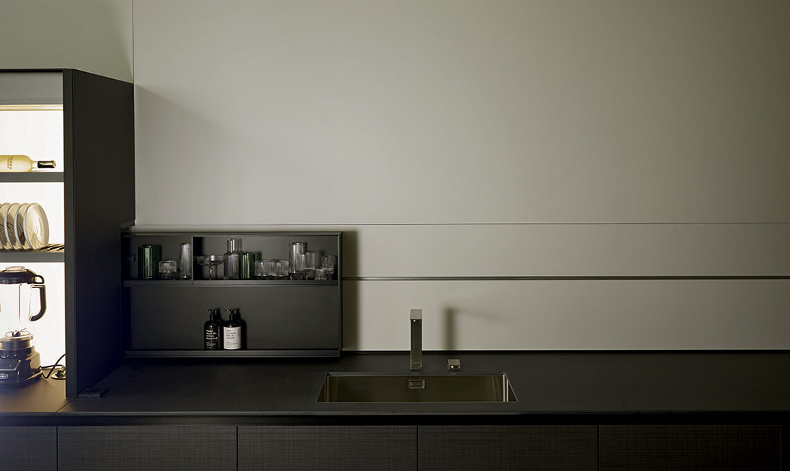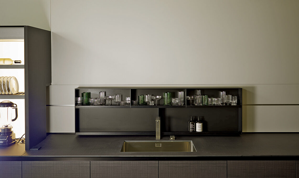 La cucina Antis di Euromobil è dotata di Ambrogio un elemento soprapiano a mensole con struttura noce canaletto materia, dotato di schermo di chiusura motorizzato in tessuto grigio. La boiserie magica Horizon è dotata di elemento scorrevole Motus in alluminio anodizzato nero, con ripiani dal profilo anti caduta. Quando occorre accedere al contenuto, Motus si estrae parzialmente o totalmente, per poi sparire dietro il modulo sopratop Ambrogio.