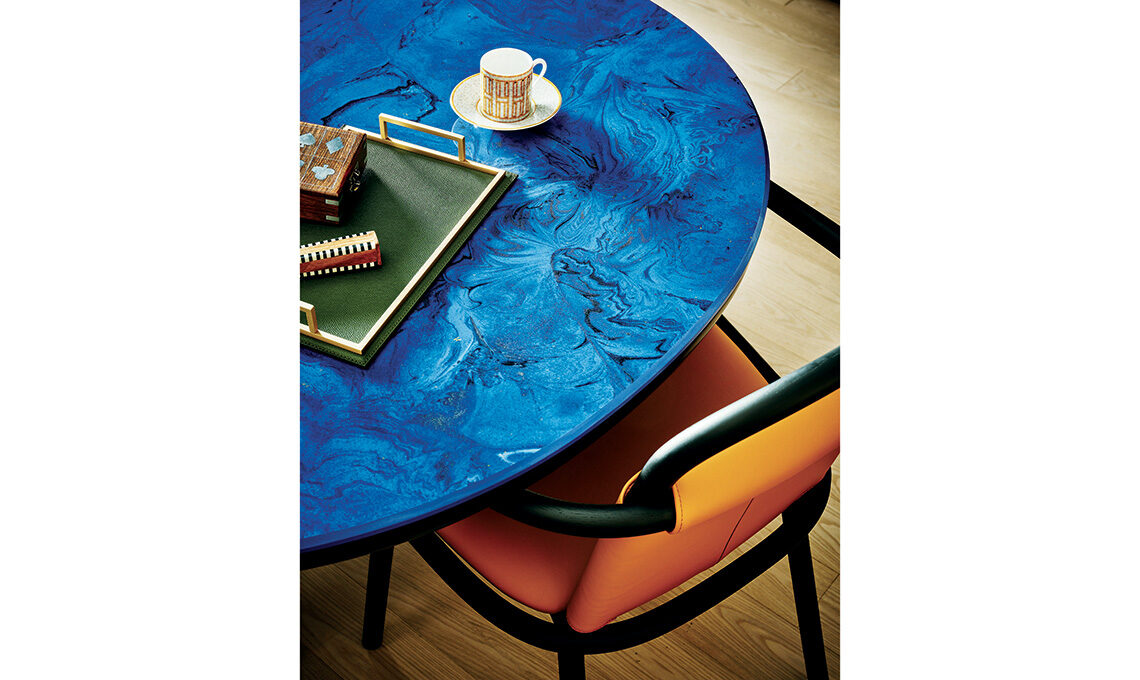 Hi-macs® è una miscela di minerali, acrilico e pigmenti naturali che dà vita a una superficie resistente, liscia, non porosa; qui, serie Lucid color Sapphire [LG Hausys].