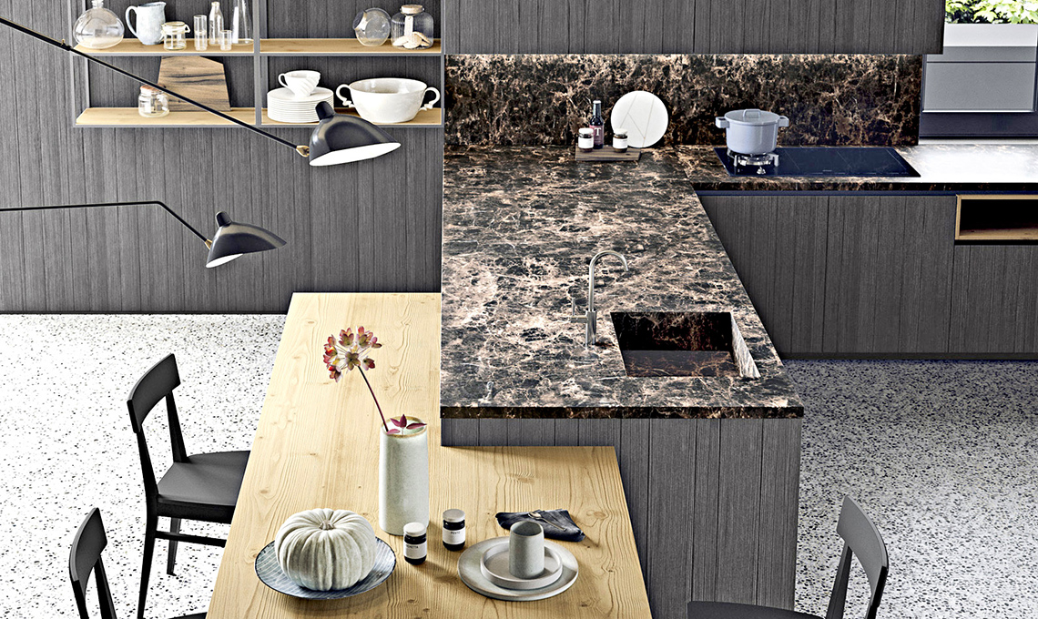 Poiché la filiera di estrazione e lavorazione dei top in pietra naturale (compresi graniti e marmi) crea tonnellate di scarti di lavorazione quasi mai riutilizzati, la giusta eco-scelta è optare per piani realizzati con polvere e scaglie della materia prima incollata e ricomposta con resine naturali a base vegetale.