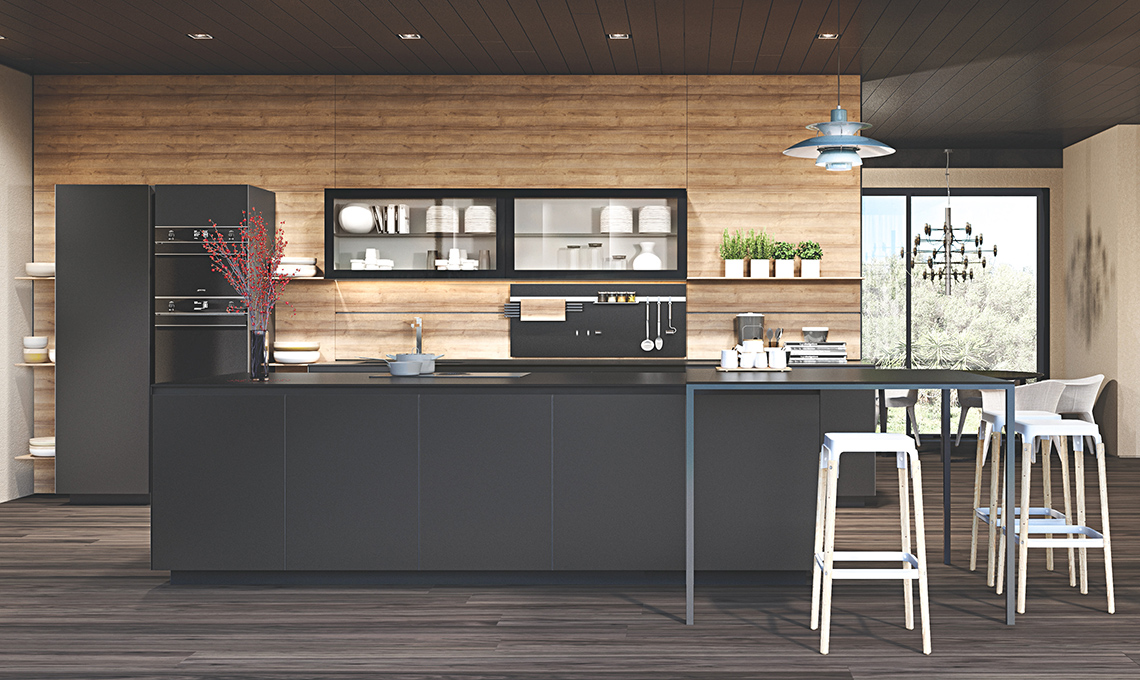 Esiste ed è caratterizzata da due materiali green come alluminio e vetro.Il primo rende le strutture leggere ma forti; il secondo, che di primo acchito può sembrare fragile, difficile da gestire e freddo, in realtà è resistentissimo (anche con spessori ridotti), igienico, non poroso ed è trattato per essere setoso al tatto. Per non parlare della facilità con cui si pulisce! Come in questa versione della cucina Telero di Euromobil, completamente in vetro e nel colore nero che dona eleganza e calore.