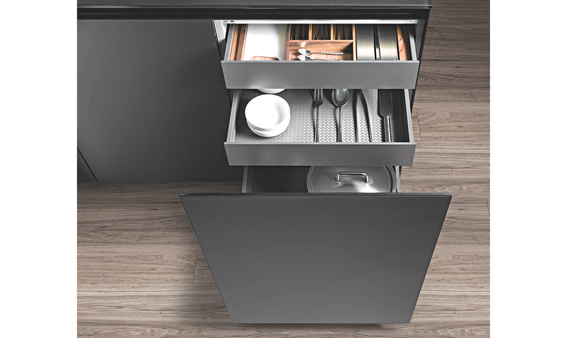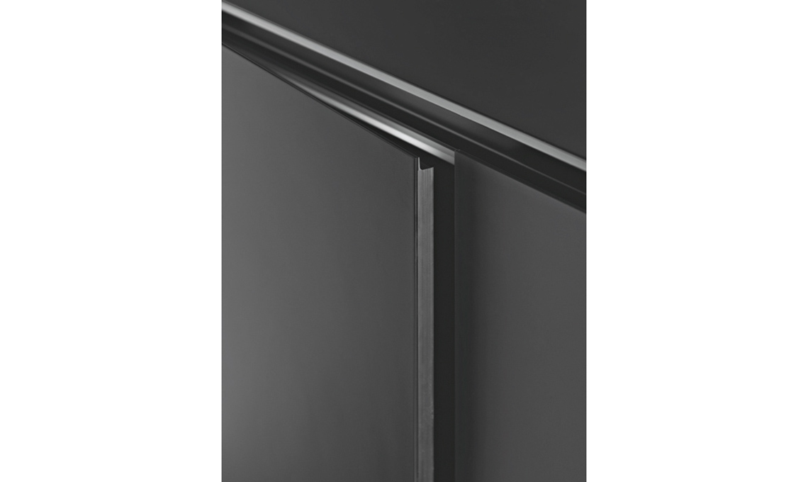 Cucina Telero [Euromobil] con ante dal telaio in alluminio anodizzato spessore 16,5 mm con lavorazione millerighe e pannello in vetro temprato spessore 4 mm, più top in vetro spessore 12 mm, tutto in nero assoluto opaco.