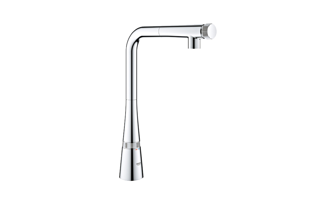 Easy: Zedra, coll. SmartControl Kitchen, si aziona schiacciando il pulsante in cima alla canna e la temperatura si regola ruotando il comando alla base [Grohe].
