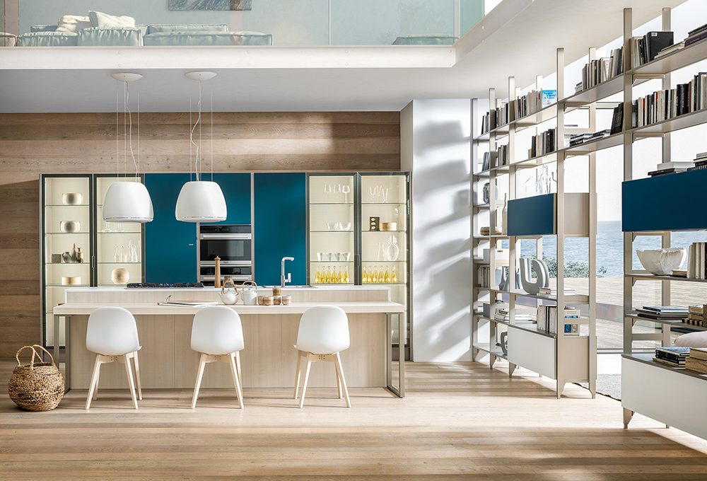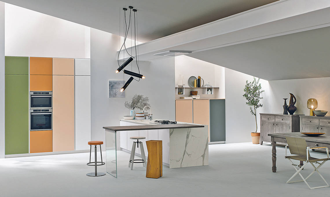 Perfetta per chi ama combinare versatilità e funzionalità, la cucina Aliant ha le ante in vetro (belle, solide e facili da pulire) e sfrutta al massimo lo spazio con colonne di altezze diverse, perfette dalla mansarda al loft. E l’isola mixa legno e HPL effetto marmo [di Stosa]. Il vetro è ecologico (100% riciclabile), igienico e disponibile in 17 nuances: così puoi colorare le ante in tonalità tutte diverse! Puoi anche scegliere la gamba trasparente che sembra far ‘volare’ il top.