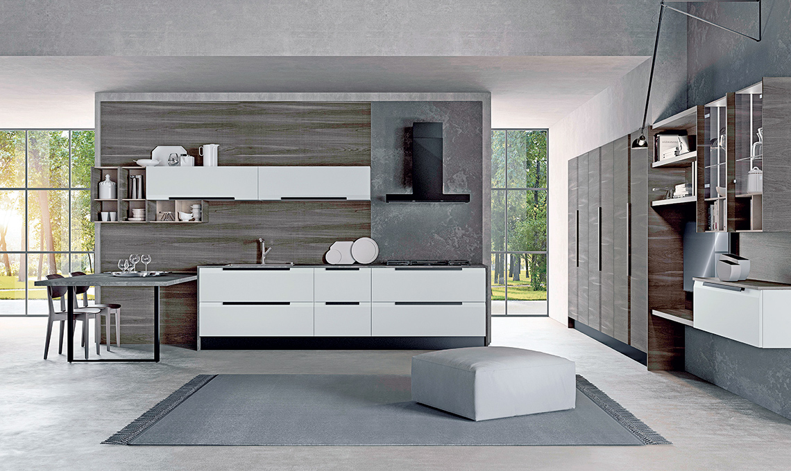 Chantal è pensata per chi ha un open space e vuole un unico stile per cucina e soggiorno. Così l’anta è diamantata e le linee minimali sono mosse da finiture a contrasto (nobilitato Olmo Black e laccato bianco). Il pezzo cult? La parete tecnologica a scomparsa [di FebalCasa]. L’armadio dalle ante a libro ospita (oltre alla dispensa) forni, abbattitore, cantinetta e frigo-congelatore. La penisola/tavolo è sostenuta dalla gamba Grid e il piano a sbalzo permette di sedersi anche a capotavola. I cestoni sono una comodità unica: ad estrazione totale, permettono di vedere subito tutto ciò che ospitano. Se vuoi una cucina ordinata ed efficiente attribuisci a ogni vano una funzione contenitiva, stivando le cose il più vicino possibile all’area di lavoro. Avrai tutto a portata di mano, senza fare sforzi. Nei pensili: nei ripiani più bassi e vicino al lavello vanno stoviglie, bicchieri e ciò che usi più volte al giorno. Più in alto, scorte di pellicole & Co. e ciò che usi raramente. Nelle basi: metti posate e tovaglie nei cassetti alti; pentole, tegami e coperchi nei cestoni estraibili vicini ai fuochi; raccolta differenziata e kit pulizia nel sottolavello. Nell’armadio: tieni la dispensa di cibi secchi, la scorta di bevande, i piccoli elettrodomestici che non stanno sul top, vassoi e piatti da portata.
