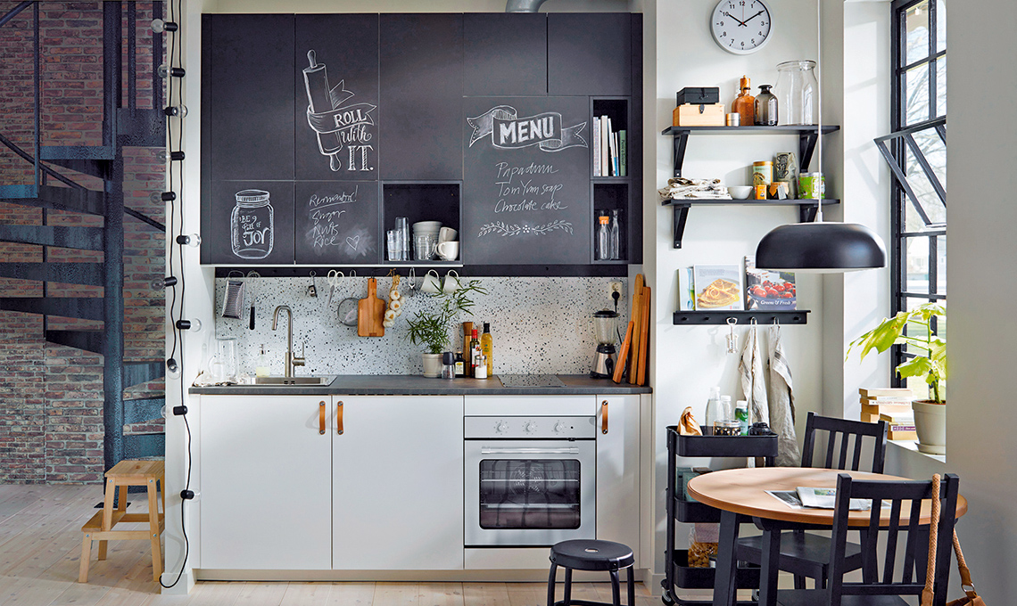 È dedicata ai creativi così come ai multitasking, l’anta nera opaca Uddevalla utilizzabile anche come lavagna e ideale per annotare ricette, liste della spesa, appuntamenti... qui abbinata alle ante Veddinge bianche per le basi e al top in laminato Ekbacken [di Ikea]. Sfrutta lo spazio in altezza grazie ai pensili di varie dimensioni e configurazioni che si possono sovrapporre all’infinito. In soli 2 metri ci sta tutto, anche il forno e il frigo sottopiano. I fuochi in vetroceramica consentono di installare la cucina dove non c’è il gas. Le maniglie in pelle conciata Östernäs sono morbide al tatto; col passare del tempo e l’utilizzo diventano sempre più belle.