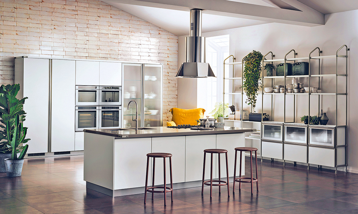 Industrial e conviviale: questa la natura della cucina Diesel Open Workshop, in versione laccato opaco Bianco Prestige, con piano in Quarz Portland Grey lucido, pensata per creare un ambiente soft, raffinato e luminoso [di Scavolini]. La parete a colonne ospita frigo e freezer, forni e un modulo con ante telaio in Acciaio Soft e vetro Ribbed Glass per stoviglie e bicchieri. La scaffalatura Stock Rack Acciaio Soft la organizzi come vuoi con mensole, pensili e basi in dimensioni differenti. L’isola operativa che serve anche da bancone snack è completata e sottolineata dalla cappa in acciaio lucido/satin Bolt.