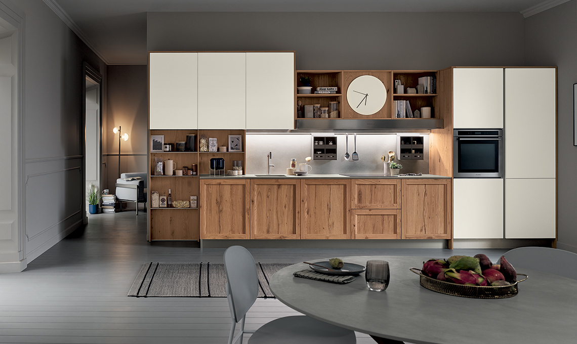 Milano, con basi, vani a giorno e boiserie Stepsystem in Rovere Nodoso Chiaro, pensili e colonne in Laccato Opaco Bianco Bicocca più top e schienale Caranto Ker City Argento [Veneta Cucine]. La boiserie Stepsystem si posiziona anche tra base e pensile per sfruttare al massimo lo spazio. Ha montanti e accessori in alluminio. Il top in Caranto Ker (formato da argille ceramiche e colori minerali inalterabili) resiste bene