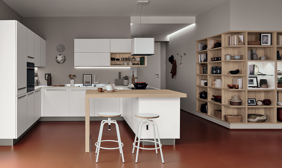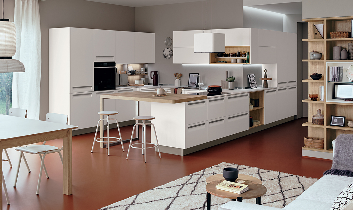 Questa composizione di Carrera F1 in laccato Opaco Plus Bianco Riso è molto articolata e si sviluppa su due angoli, creando una forma ad ‘S’ che viene attenuata dalla penisola e dal bancone snack integrato. La finitura bianca opaca si alterna con l’effetto legno del Colorboard Play Rovere Medio dei moduli Stepsystem, del bancone, degli inserti a giorno e del living.
