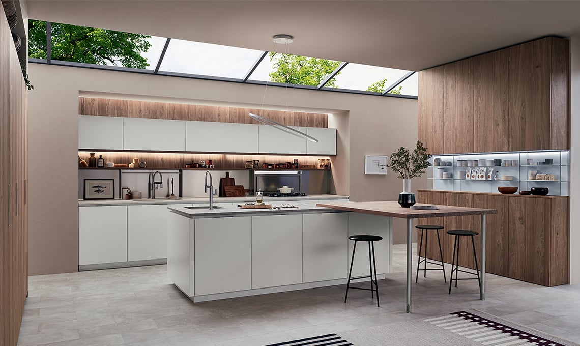 In questa versione la cucina Lounge in laccato Opaco Bianco Puro si sviluppa intorno all’isola centrale che si completa con un bancone in Noce Nodoso e gli sgabelli Trinity, appartenenti al catologo Add More. Dietro l’isola, la parte operativa è resa ancora più funzionale ed efficiente grazie all’utilizzo di 5 moduli Stepsystem con schienale in acciaio, di cui uno ospita la cappa integrata all’interno. Richiamando il materiale delle colonne Scrigno e il living, la pannellatura retro pensile è in Noce Nodoso che si presta particolarmente al gioco di luci ricreato utilizzando la mensola sotto i pensili accessoriata con illuminazione led e il ripiano superiore dello Stepsystem, che inoltre permette di riporre gli oggetti di uso frequente. A sinistra, le colonne Scrigno con apertura ad anta rientrante sul fianco laterale permettono di contenere elettrodomestici o di interpretare la dispensa in maniera innovativa. A destra, invece, lo spazio tra i moduli superiori e inferiori del Living è ottimizzato tramite l’inserimento di moduli Stepsystem in vetro, meno invasivi e più essenziali dei moduli in metallo.