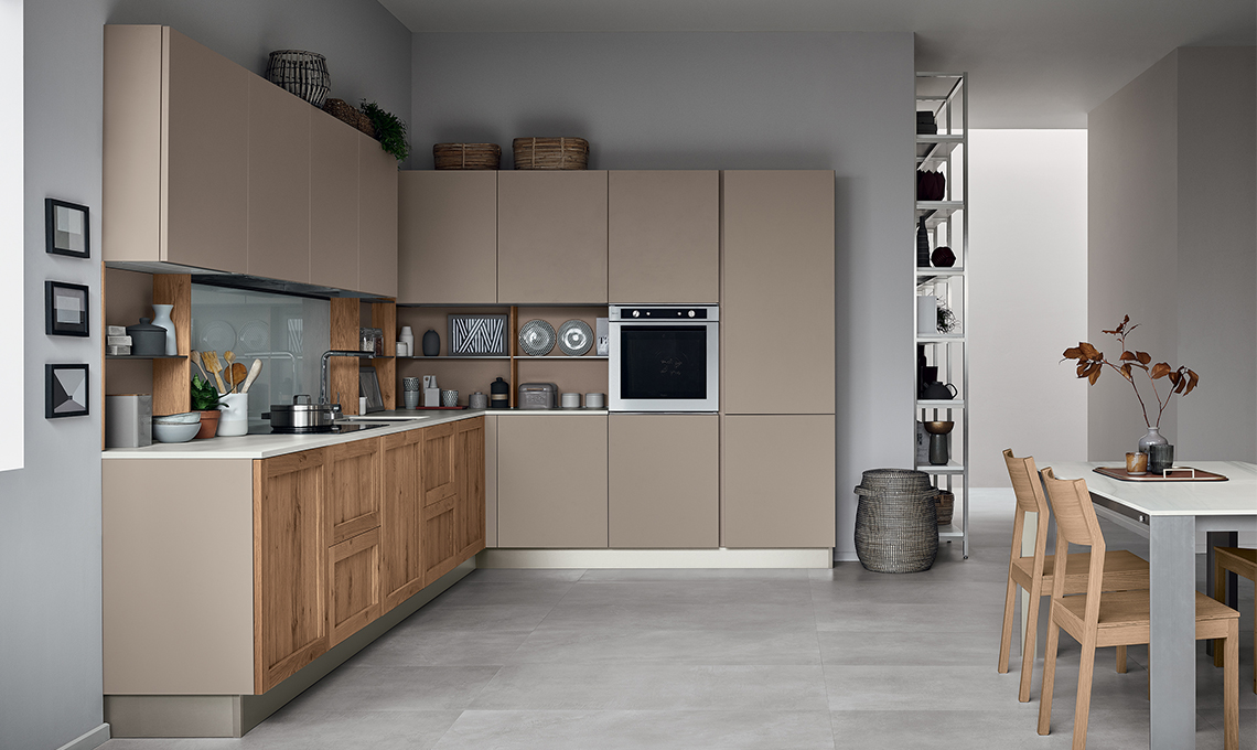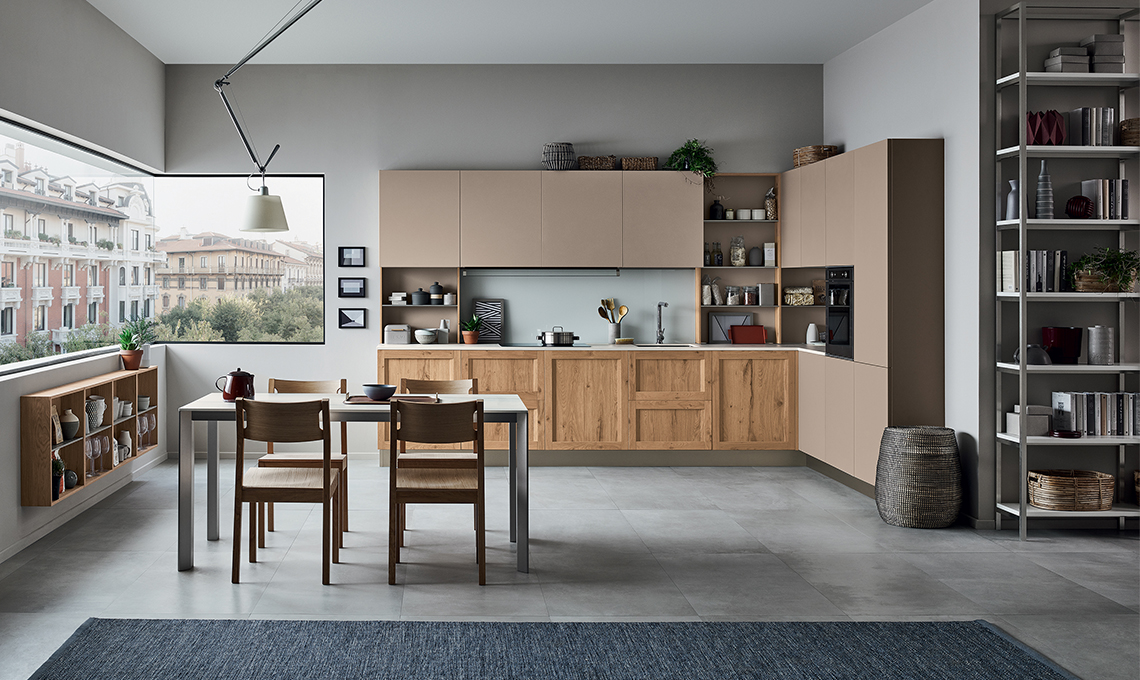 Questa configurazione a elle della cucina Milano in laccato Opaco Beige Ticinese e Rovere Nodoso Chiaro che si mescolano nei moduli di Stepsystem Reverse dove gli schienali sono in laccato Beige Ticinese, gli elementi verticali sono in Rovere Nodoso Chiaro ed i ripiani in alluminio. Il top è in Caranto Ker Bianco Venato Naturale e un grande schienale luminoso è posizionato dietro la zona lavaggio. Nella stessa stanza, oltre la cucina, trovano posto anche il tavolo Dubai e le sedie Mojito tinto Rovere Naturale Chiaro.