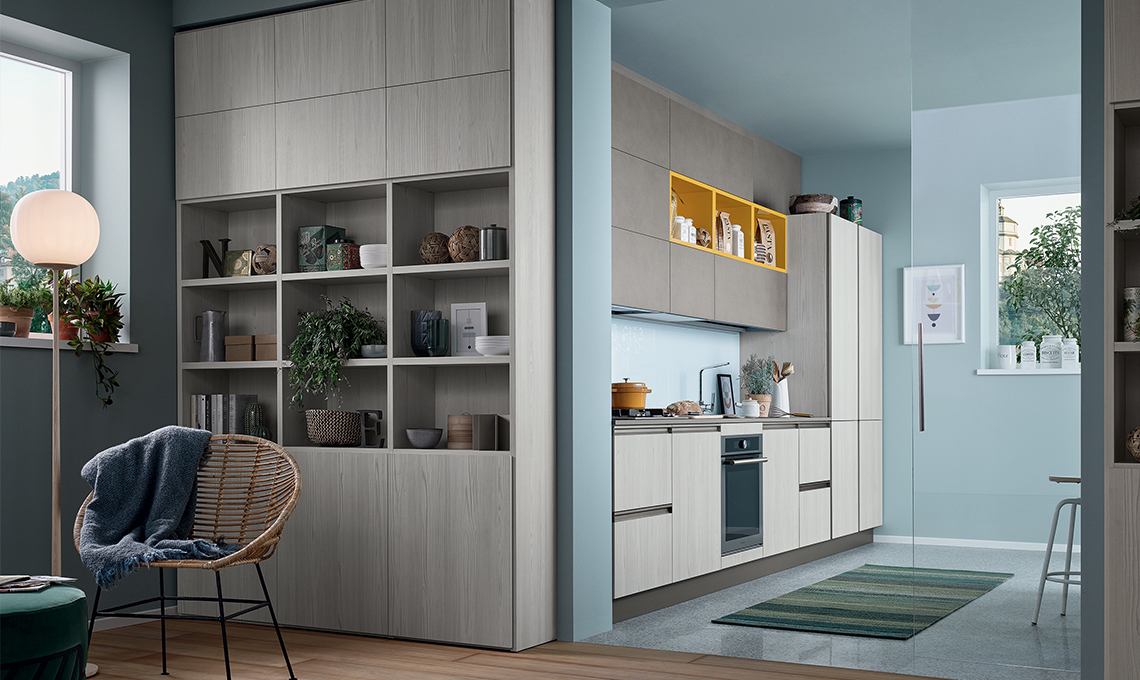 Questa composizione lineare di Start Time si inserisce in una nicchia dove il progetto cucina è ben studiato e costruito. L’uso del colore gioca un ruolo fondamentale: i tre vani a giorno integrati in Laccato Lucido Giallo Girasole spezzano la regolarità dei pensili in Graffiato Scuro e riscaldano la tonalità chiara del Timber Bianco delle basi e delle colonne. Tra basi e pensili è stato inserito uno schienale luminoso che riempie tutto lo spazio. Maniglia Presa finitura Bronzo e top in laminato Smart Creta. La composizione si chiude con un bancone snack in laminato Smart Bianco e due sgabelli Susy. Uscendo dalla cucina troviamo un living in Timber Bianco, elemento che integra i due ambienti domestici.